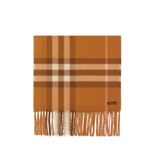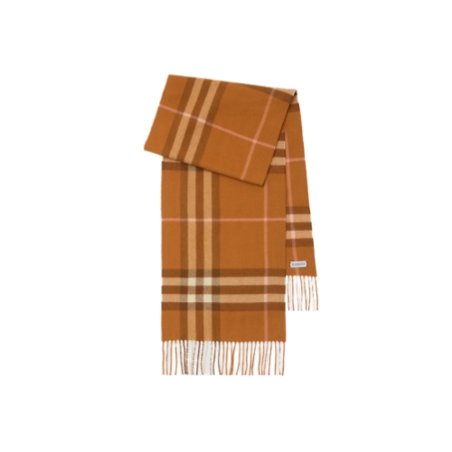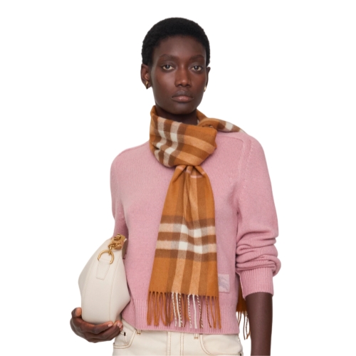 The iconic Burberry Check cashmere scarf, made in Scotland at a mill founded in 1797. Woven on traditional looms, the scarf takes more than 30 steps to complete. The fabric is washed in local spring water and brushed with teasels – dried flowers that are drawn along the surface of the cashmere to 'raise' the cloth, creating a natural lustre and ultra-soft finish.