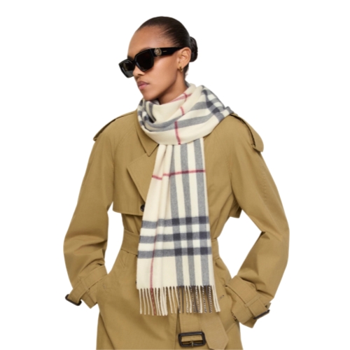 The iconic Burberry Check cashmere scarf, made in Scotland at a mill founded in 1797. Woven on traditional looms, the scarf takes more than 30 steps to complete. The fabric is washed in local spring water and brushed with teasels – dried flowers that are drawn along the surface of the cashmere to 'raise' the cloth, creating a natural lustre and ultra-soft finish.