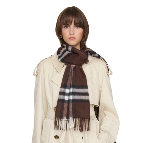 The iconic Burberry Check cashmere scarf, made in Scotland at a mill founded in 1797. Woven on traditional looms, the scarf takes more than 30 steps to complete. The fabric is washed in local spring water and brushed with teasels – dried flowers that are drawn along the surface of the cashmere to ’raise’ the cloth, creating a natural lustre and ultra-soft finish.