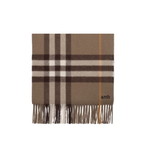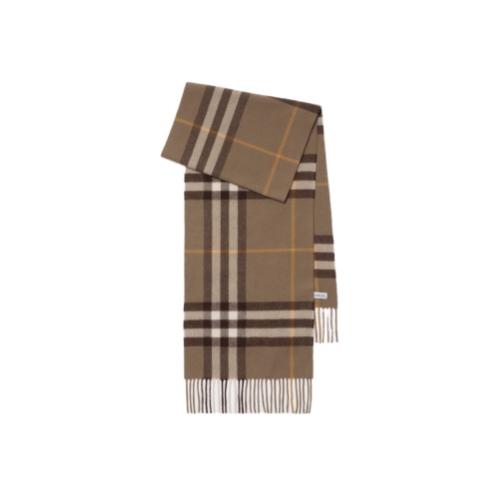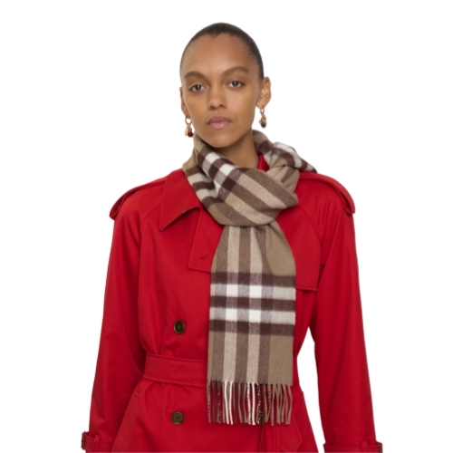 The iconic Burberry Check cashmere scarf, made in Scotland at a mill founded in 1797. Woven on traditional looms, the scarf takes more than 30 steps to complete. The fabric is washed in local spring water and brushed with teasels – dried flowers that are drawn along the surface of the cashmere to 'raise' the cloth, creating a natural lustre and ultra-soft finish.