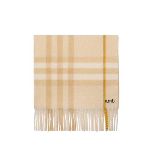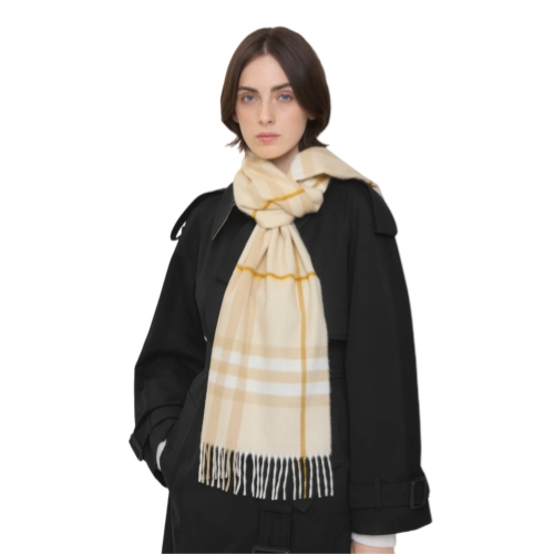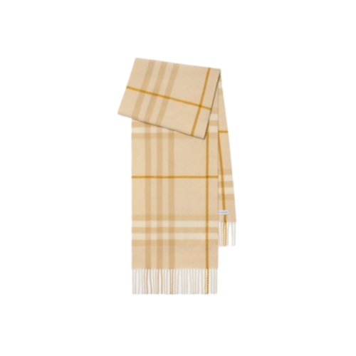 The iconic Burberry Check cashmere scarf, made in Scotland at a mill founded in 1797. Woven on traditional looms, the scarf takes more than 30 steps to complete. The fabric is washed in local spring water and brushed with teasels – dried flowers that are drawn along the surface of the cashmere to 'raise' the cloth, creating a natural lustre and ultra-soft finish.