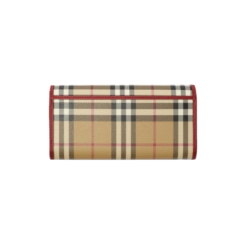 A continental wallet made from a coated cotton blend printed with the Burberry Check. The design is trimmed with calf leather in seasonal ruby red and detailed with a logo-engraved press stud.