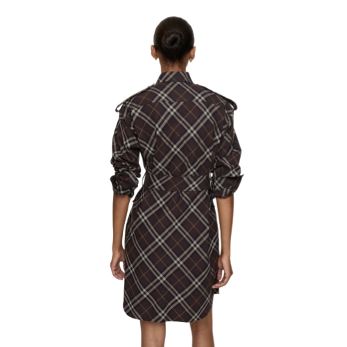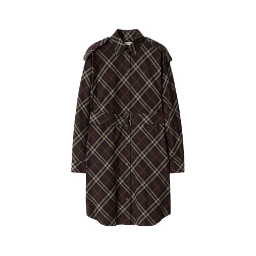 A shirt dress in cotton flannel woven with the Burberry Check in seasonal truffle brown. The mid-length style is tailored to a relaxed fit with a B buckle belt to adjust the silhouette. Epaulettes at the shoulders are inspired by our signature trench.