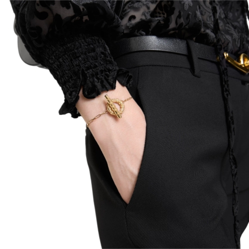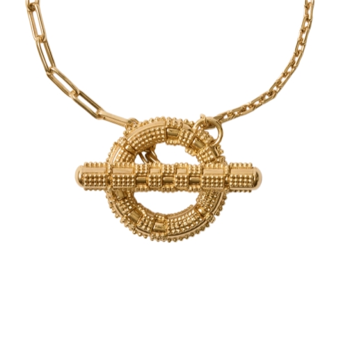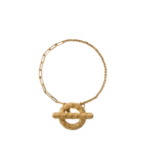 A gold-plated bracelet crafted in Italy with chain links in contrasting sizes. Inspired by the ancient granulation technique, tiny spheres of metal are intricately soldered onto the medallion and T-bar fastening to form a tactile check pattern.