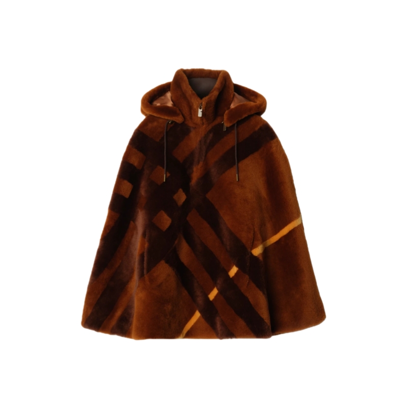 A funnel-neck cape crafted in Italy from panels of super-soft shearling, intricately cut and stitched to form an intarsia Burberry Check. The style is fully lined and features side zips to create arm openings. Comes with a detachable hood for added protection against the elements.