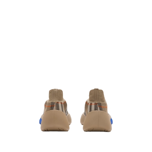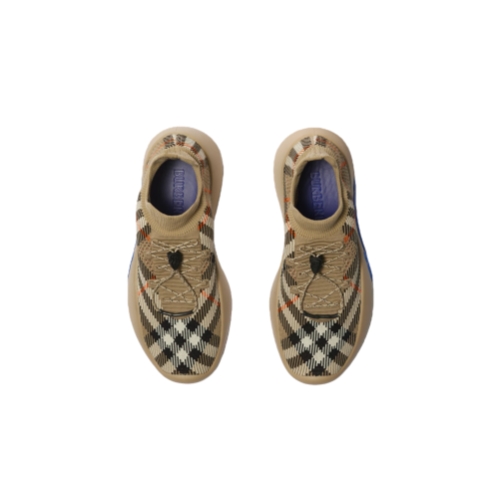 Italian-made sneakers with a breathable sock upper knitted with the Burberry Check. The leather-lined style features check laces with a B shield toggle and an oversized Equestrian Knight Design that wraps around the sole. Part of Burberry Classics, wardrobe foundations with a unique Burberry slant.