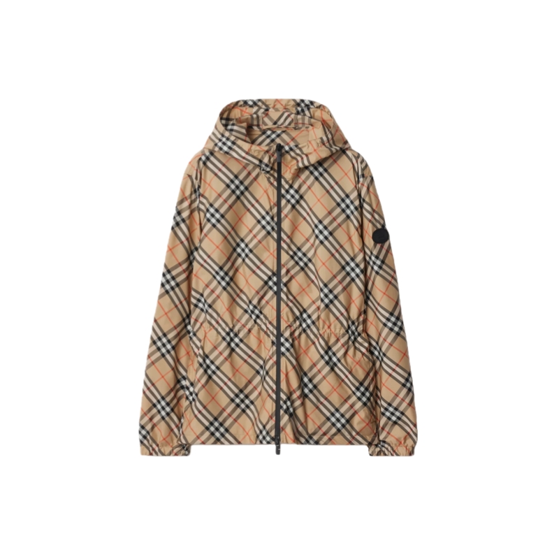 A hooded jacket woven with the Burberry Check, cut to a relaxed fit with a drawcord to adjust the waist. The lightweight style is appliquéd with our Knight stamp at the sleeve – an archival motif first seen on Burberry bags in the 1980s.