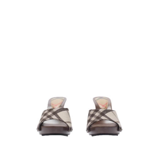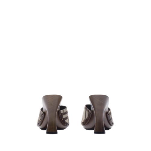 A pair of heeled mules crafted in Italy from a Burberry Check cotton blend edged with leather and metal stud detailing. Inspired by traditional clogs, the Potter is finished with a cushioned heel and set on a wooden sole embossed with the Equestrian Knight Design.