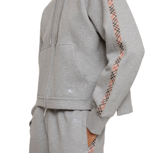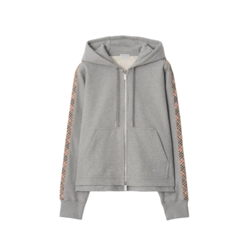 A zip hoodie in lightweight loop-back cotton, cut to a relaxed fit. The style is embroidered with the Equestrian Knight Design and framed with Burberry Check taping at the sleeves.