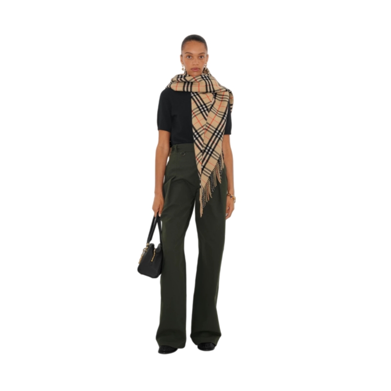 A cape in wool cashmere woven with the Burberry Check. Made at a Scottish mill founded in 1797, the fabric is washed in local spring water and receives two further washes for an ultra-soft finish and raised nap.
