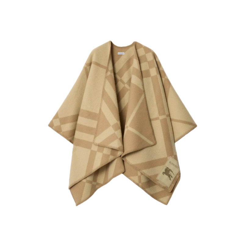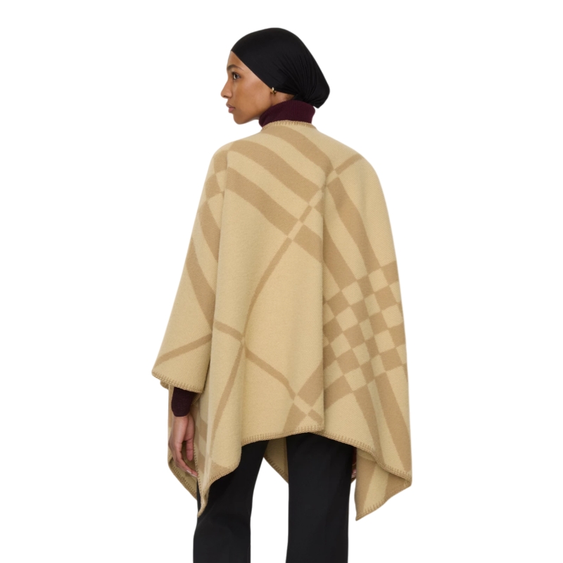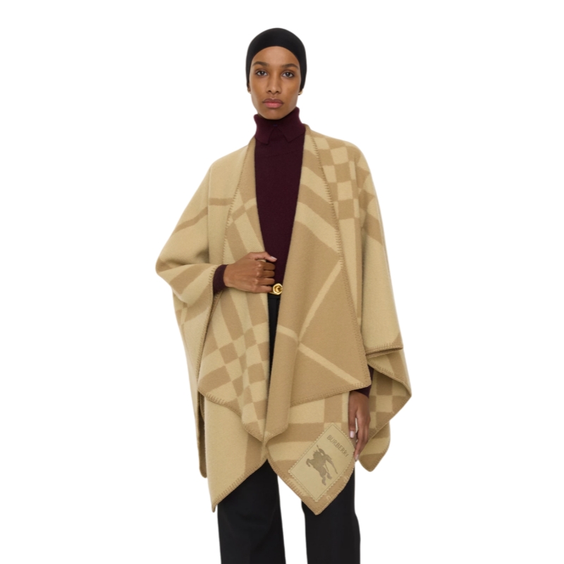 A cape in soft wool cashmere, jacquard-woven with a two-tone Burberry Check on an exaggerated scale. Crafted at a Scottish mill founded in 1797, the style is finished with a tonal suede label embossed with the Equestrian Knight Design.