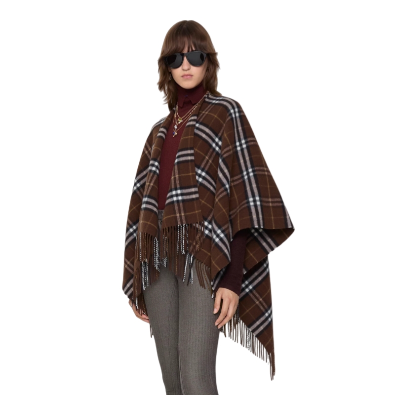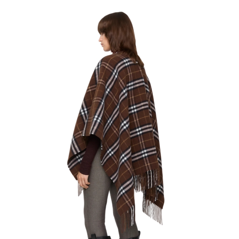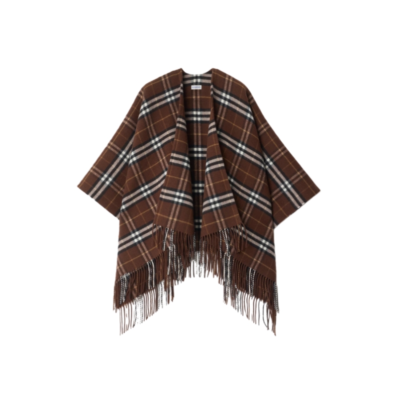 A cape made from double-faced wool cashmere, woven in the Burberry Check at a Scottish mill founded in 1797. The fabric is washed in local spring water and receives two additional washes for an ultra-soft finish and raised nap.