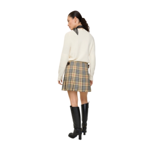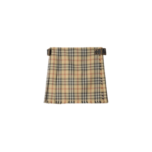 A mini kilt made in Scotland from wool twill, woven with a seasonal expression of the Burberry Check and edged with eyelash fringing. The mid-rise, straight silhouette is tailored with pleats and can be adjusted using the leather strap and antique-finish B buckles.