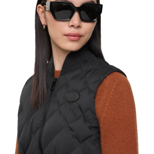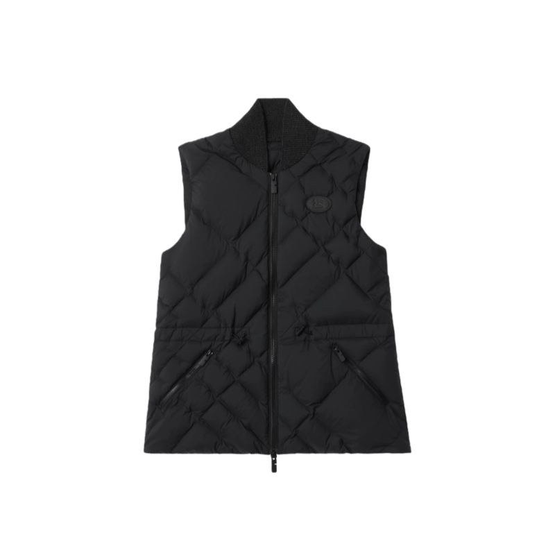 A gilet in lightweight water-resistant nylon detailed with our check-stitch – a new take on quilted stitching inspired by the iconic house code. The style is knitted with a tonal wool-blend collar and finished with an appliquéd leather Knight stamp, an archival motif first seen on Burberry bags in the 1980s. Cut to a regular fit that cinches at the waist and filled with goose down and feathers for warmth.