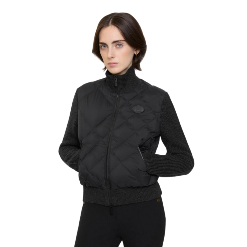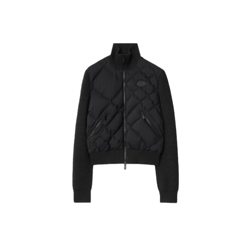 A jacket in lightweight water-resistant nylon detailed with our check-stitch – a new take on quilted stitching inspired by the iconic house code. Padded with goose down and feathers for warmth, the hybrid silhouette is knitted with a tonal wool-blend collar, hem and sleeves. Cut to a slim fit and finished with an appliquéd leather Knight stamp, an archival motif first seen on Burberry bags in the 1980s.