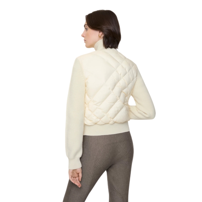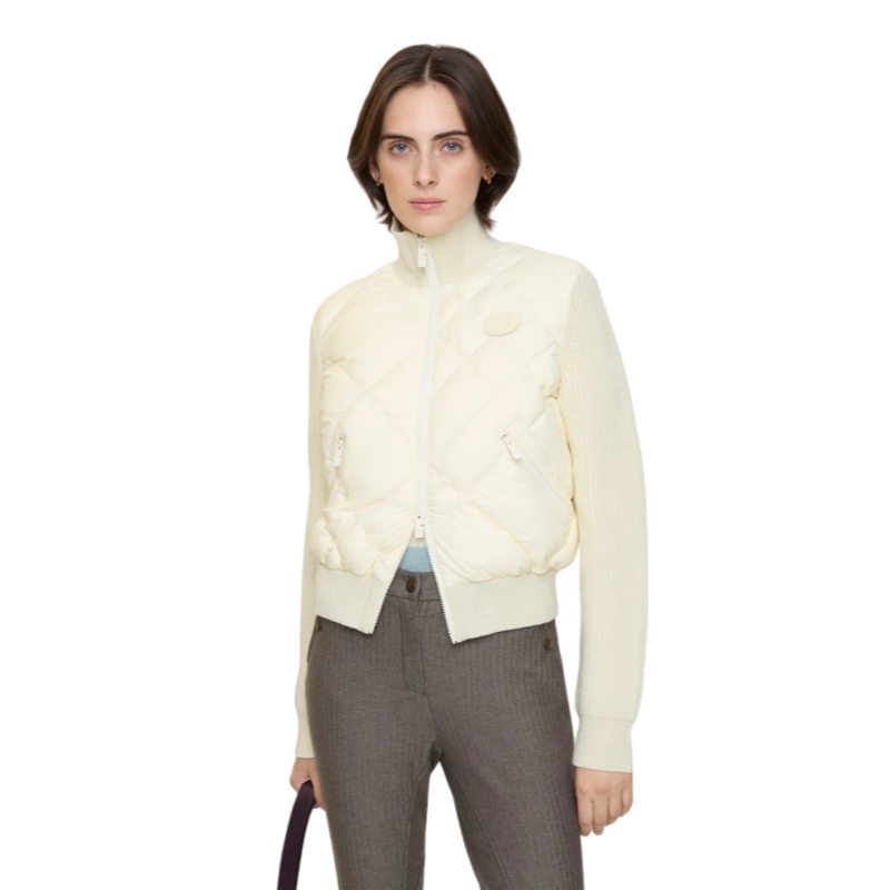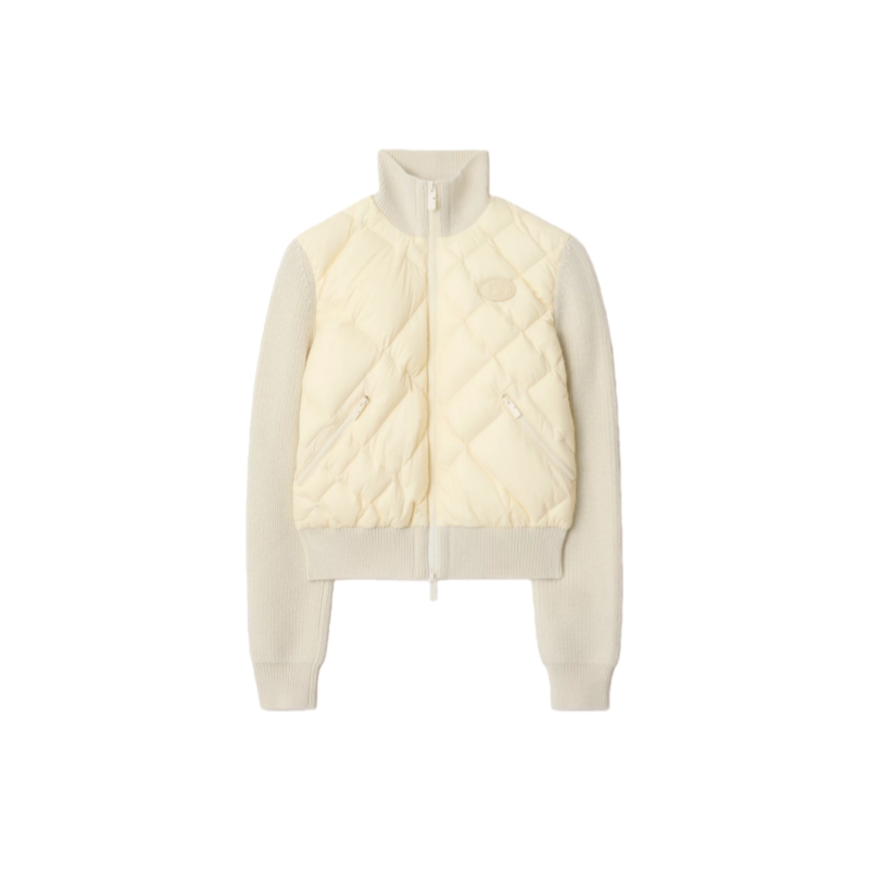 A jacket in lightweight water-resistant nylon detailed with our check-stitch – a new take on quilted stitching inspired by the iconic house code. Padded with goose down and feathers for warmth, the hybrid silhouette is knitted with a tonal wool-blend collar, hem and sleeves. Cut to a slim fit and finished with an appliquéd leather Knight stamp, an archival motif first seen on Burberry bags in the 1980s.