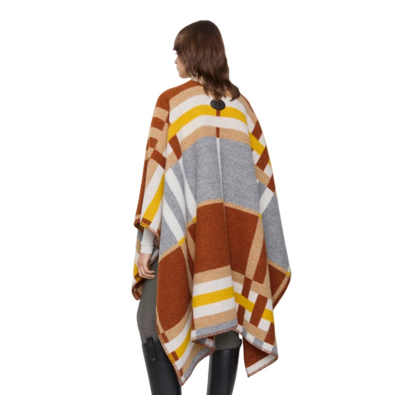 A wool cape made at a Scottish mill founded in 1797, jacquard-woven with the Burberry Check in a colour-block design. The yarn originates from sheep native to the Shetland Islands, celebrated for their fine, soft fleece. The style is edged with blanket stitching and features a leather Knight stamp appliqué – an archival motif first seen on Burberry bags in the 1980s. Comes with a horse-shaped pin inspired by our Equestrian Knight Design.