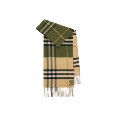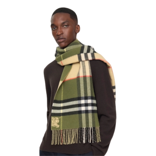 A scarf in double-faced cashmere, jacquard-woven with our Equestrian Knight Design motif and the Burberry Check in contrasting colours. Made at a Scottish mill founded in 1797, the fabric is washed in local spring water and brushed with teasels – dried flowers that are drawn along the surface of the cashmere to 'raise' the cloth, creating a natural lustre and ultra-soft finish.