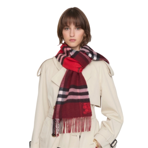 A scarf in double-faced cashmere, jacquard-woven with our Equestrian Knight Design motif and the Burberry Check in contrasting colours. Made at a Scottish mill founded in 1797, the fabric is washed in local spring water and brushed with teasels – dried flowers that are drawn along the surface of the cashmere to 'raise' the cloth, creating a natural lustre and ultra-soft finish.