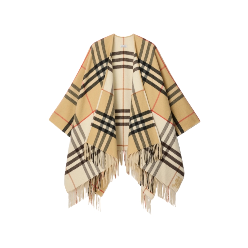 A cape in double-faced cashmere wool woven with the Burberry Check in contrasting colours. Made at a Scottish mill founded in 1797, the fabric is washed in local spring water and receives two further washes for an ultra-soft finish. The fringed style is finished with a tonal Equestrian Knight Design.