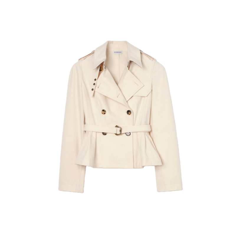 The iconic Burberry trench is recast as a cropped jacket in a midweight textured cotton, washed for a soft finish. The structured silhouette is cut slim at the waist and flares to a peplum hem, with an adjustable B buckle belt in an antique finish. Pop up the collar to reveal a contrasting flash of Burberry Check.