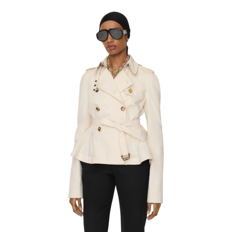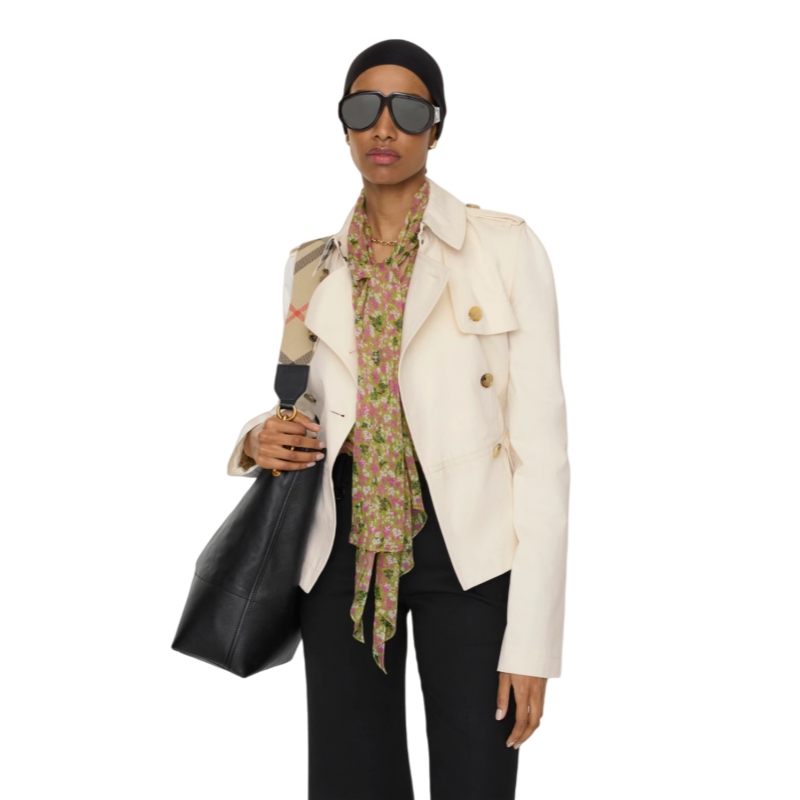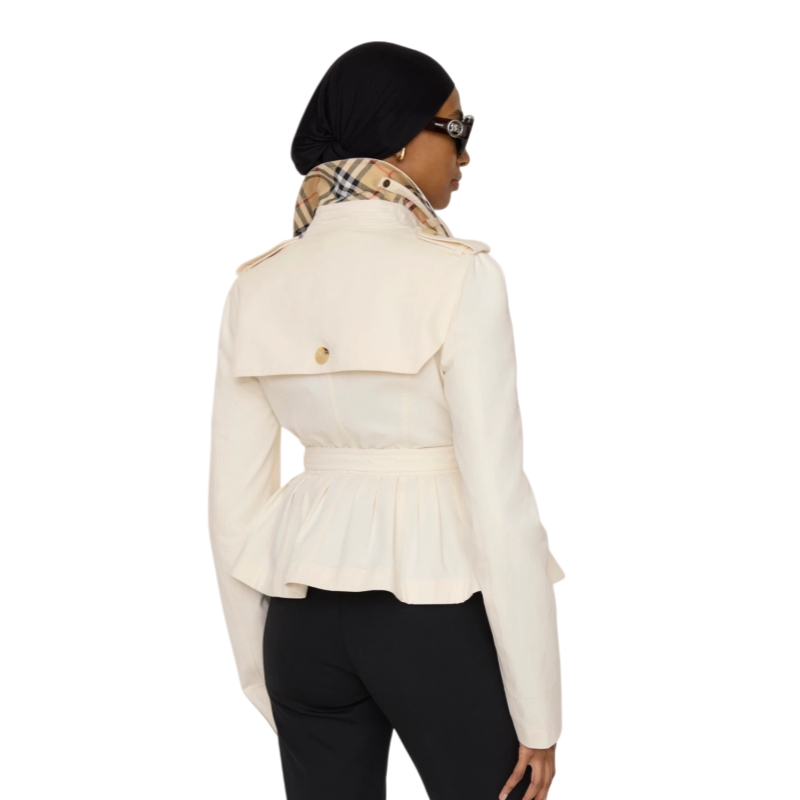The iconic Burberry trench is recast as a cropped jacket in a midweight textured cotton, washed for a soft finish. The structured silhouette is cut slim at the waist and flares to a peplum hem, with an adjustable B buckle belt in an antique finish. Pop up the collar to reveal a contrasting flash of Burberry Check.