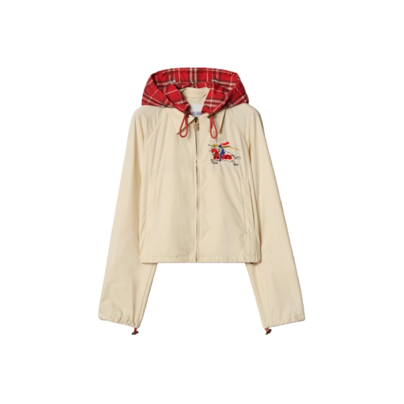 The classic Harrington jacket is reworked in a lightweight stretch nylon twill, with a detachable Burberry Check hood for unpredictable British weather. The cropped silhouette is cut to a relaxed fit with raglan sleeves for a softly curved shoulder. Our Equestrian Knight Design is embroidered at the chest in textured and metallic threads – created as part of our Year of the Horse capsule.