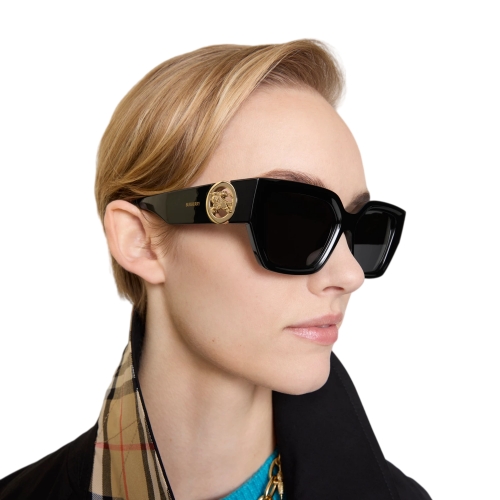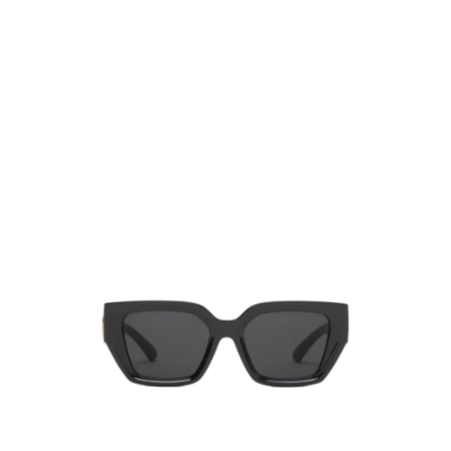 A pair of rectangular cat-eye sunglasses made in Italy from nylon. The wide sculptural temples are printed with our logo and feature a polished metal hinge with a cut-out Equestrian Knight Design motif.
