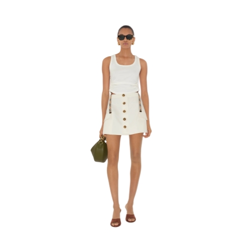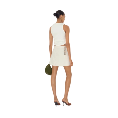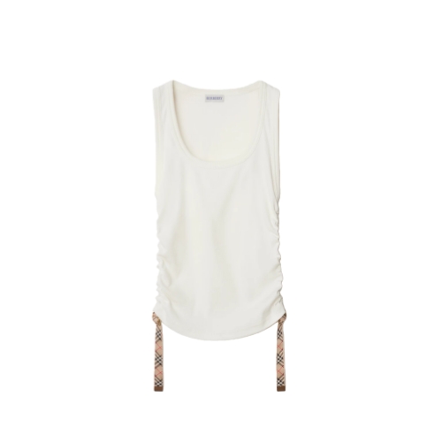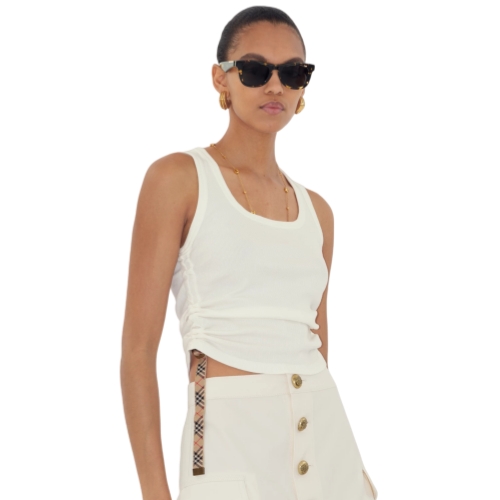 Debuted on the Burberry Summer 2025 runway, a rib-knit tank top in a cotton blend jersey. Cut to a slim fit, the ruched sides can be adjusted with the Burberry Check side straps and B buckles.