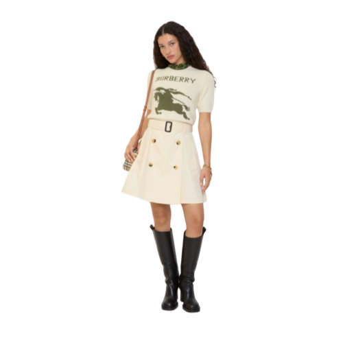 Reworking our signature rainwear, a trench mini skirt made in Yorkshire from water-resistant cotton gabardine. The fabric is woven at the Burberry Mill and treated for a soft finish. Sitting high on the waist, the flared, A-line silhouette features a detachable B buckle belt to adjust the fit.