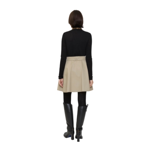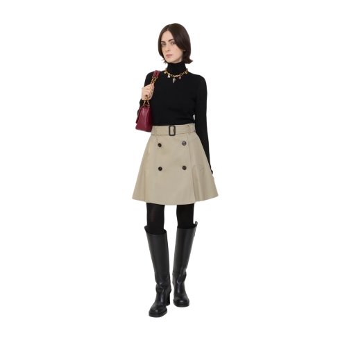 Reworking our signature rainwear, a flared trench mini skirt in water-resistant cotton gabardine. The fabric is woven at the Burberry Mill in Yorkshire. Sitting high on the waist, the A-line style features a detachable B buckle belt to adjust the fit.