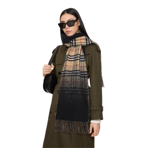 A double-faced cashmere scarf, jacquard-woven with a subtle gradient that blends the Burberry Check into a solid treacle brown colourway. Made at a family-run mill in Scotland, the fabric is washed in local spring water and brushed with teasels – dried flowers that are drawn along the surface of the cashmere to ’raise’ the cloth, creating a natural lustre and ultra-soft finish. Two further washes are given for a fuller texture.