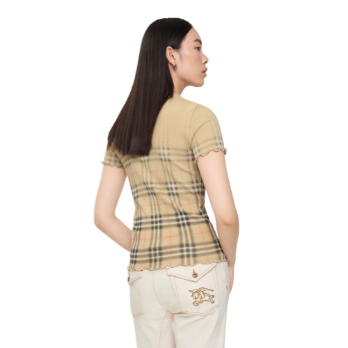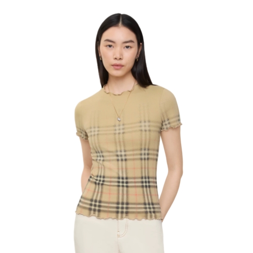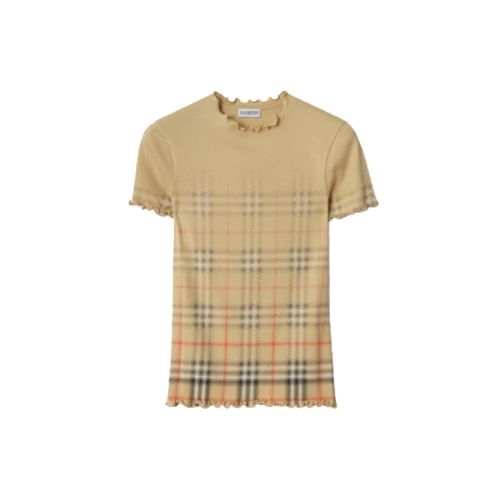 A short-sleeved top knitted from lightweight cotton with a hint of stretch. The ribbed silhouette features ruffled edges and is printed with a subtle gradient that blends the Burberry Check into a solid colour.