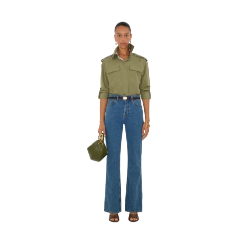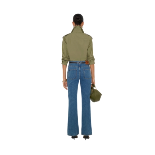 Jeans made in Italy from stretch denim in a mid-blue wash. The five-pocket bootcut style features diagonal belt loops at the back and a suede patch embossed with the Equestrian Knight Design.