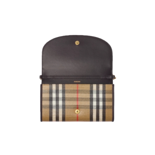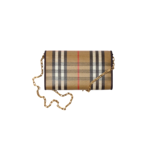 A wallet made from a cotton linen blend trimmed with smooth calf leather. The fabric is jacquard-woven with the Burberry Check and has a coated finish inspired by rainwear and the outdoors. The design is detailed with our Knight stamp, an archival motif first seen on Burberry bags in the 1980s. Carry as a mini bag using the chain crossbody strap.