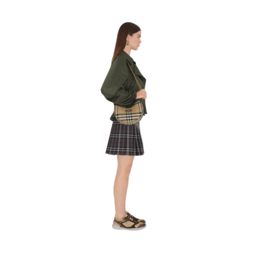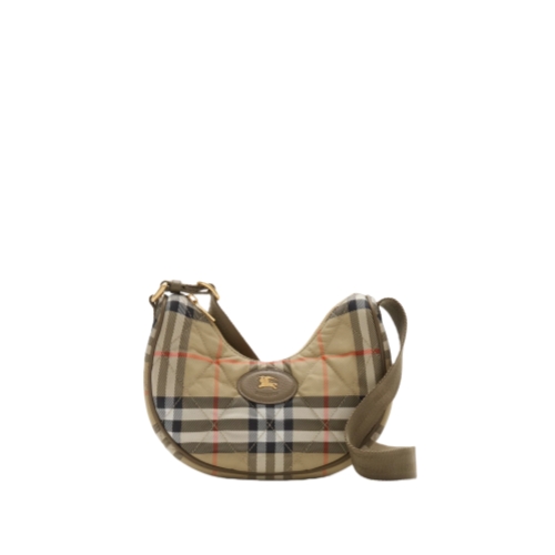 Inspired by country pursuits, the Horseshoe crossbody bag is made from quilted nylon woven with the Burberry Check in seasonal teacup pink. The design is trimmed with tonal leather and our Knight stamp, an archival motif first seen on Burberry bags in the 1980s. Switch from a shoulder to a crossbody bag using the adjustable webbing strap.