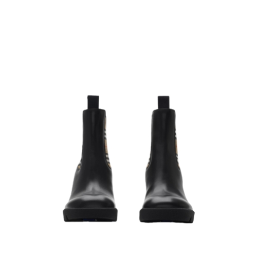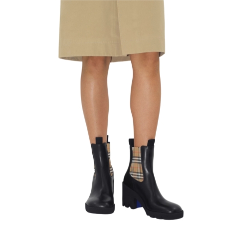Italian-made Chelsea boots in textured calf leather with pull tabs and Burberry Check panels. The design is set on a block heel and chunky sole moulded with archive Burberry lettering. Part of Burberry Classics, wardrobe foundations with a unique Burberry slant.