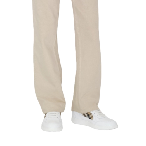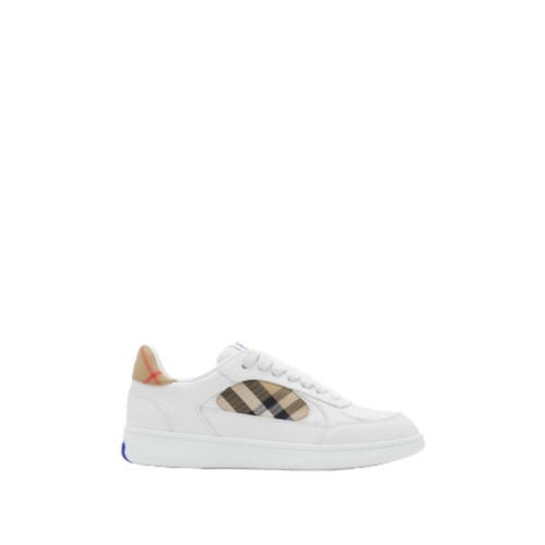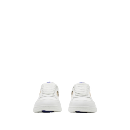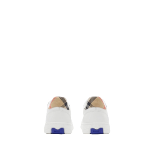 Italian-made sneakers in smooth calf leather, with a contrasting cuff and side panel woven with the Burberry Check in our signature sand colourway. The style features an Equestrian Knight Design label and the soles are moulded with archive Burberry lettering.