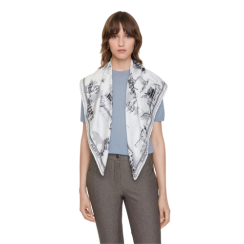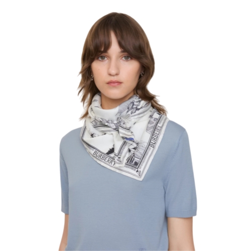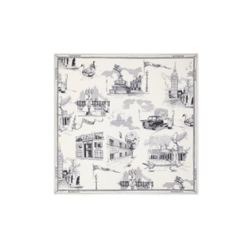 A scarf made in Italy from silk twill. The design is printed with hand-drawn artwork depicting iconic London landmarks including the Houses of Parliament, Tower Bridge, Trafalgar Square and our Horseferry House headquarters.