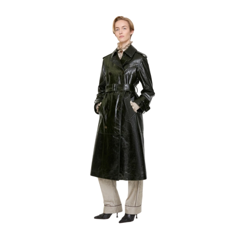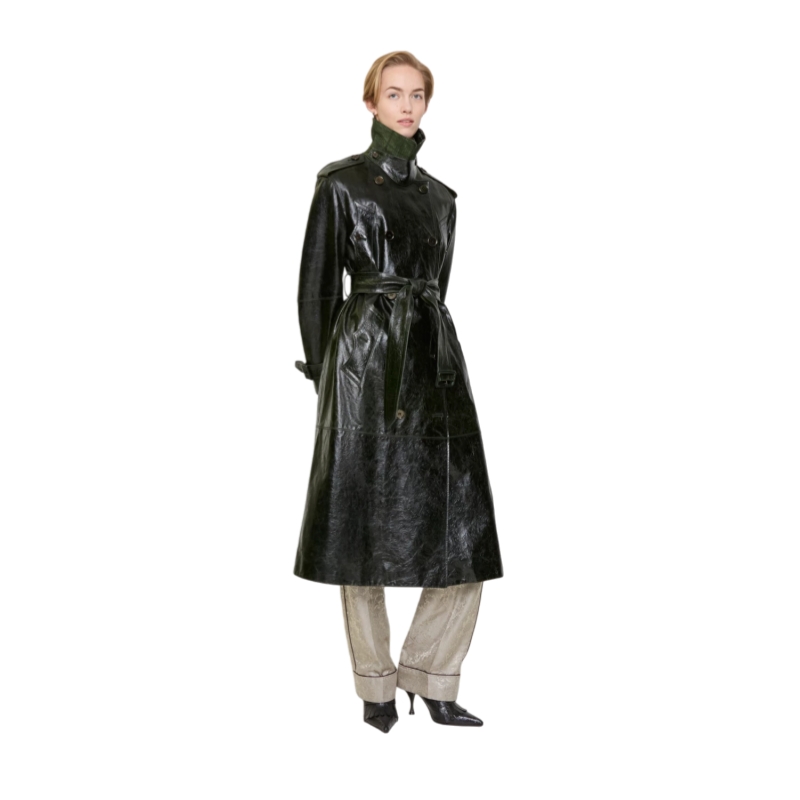 Reworking signature Burberry rainwear, a trench coat made in Italy from embossed calf leather. The Baroque-style pattern is inspired by the exquisite, faded interiors of British stately homes. Debuted on the Burberry Winter 2025 runway, the style is cut to a relaxed fit with wide raglan sleeves and lined with a tonal Burberry Check. An archival coat inspires the curlicue shape of the pockets and the undercollar is subtly stitched with our signature check.