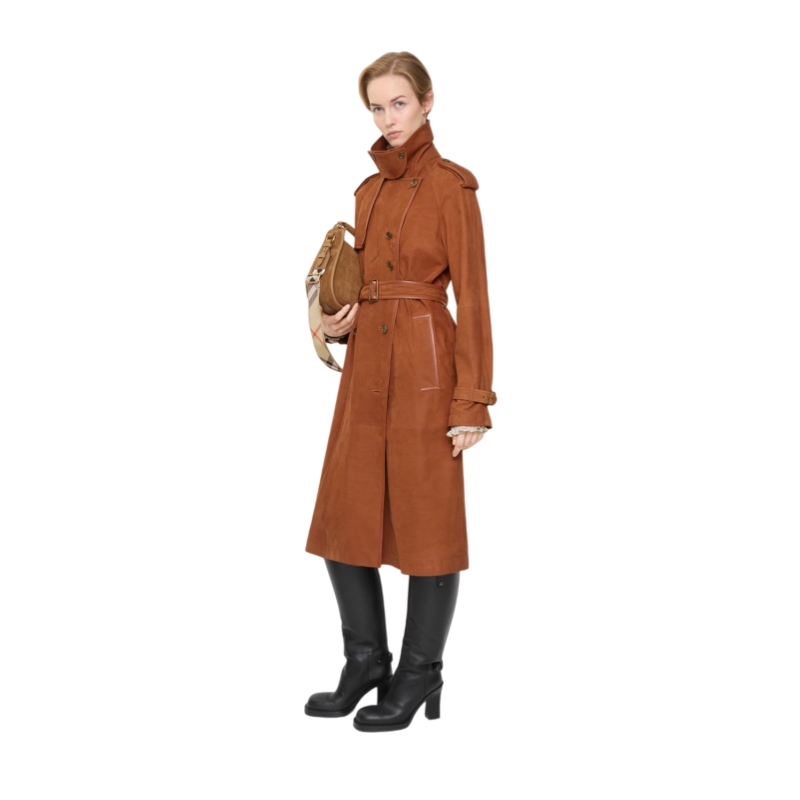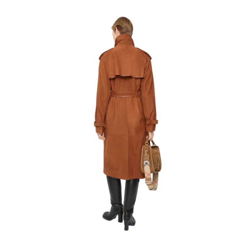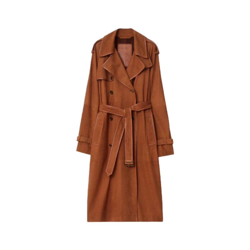 A fresh expression of our Castleford trench coat, crafted in Italy from soft nubuck and framed with nappa leather trims. The unlined style is cut to a generous, regular fit with soft shoulders for effortless layering over knitwear and tailoring. Finished with check stitching under the collar and metal hardware in an antique finish.