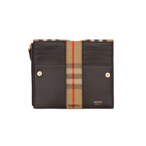 A slim wallet made from grainy calf leather, lined with a Burberry Check cotton linen blend in signature sand beige. The Bloomsbury collection is finished with a leather and metal Knight stamp, an archival motif first seen on Burberry bags in the 1980s.