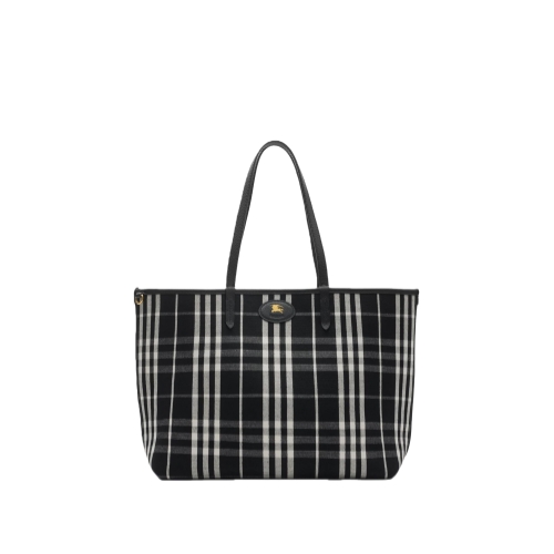 A spacious tote made in Italy from grainy calf leather, reversing to a Burberry Check cotton linen blend in our classic black and calico beige. The Bloomsbury collection is finished with a leather and metal Knight stamp, an archival motif first seen on Burberry bags in the 1980s. Comes with a detachable press-stud pouch to secure smaller items.