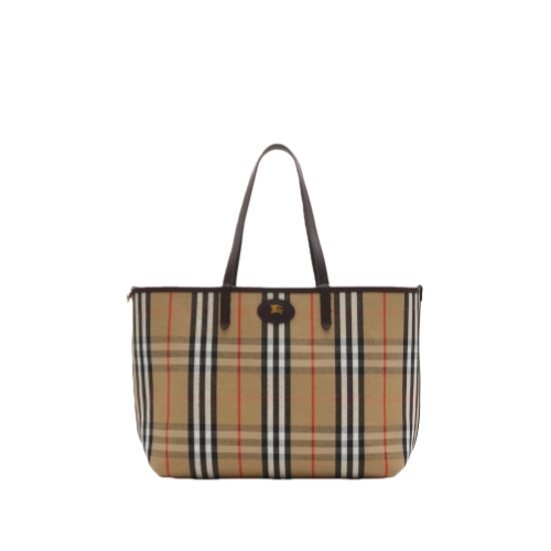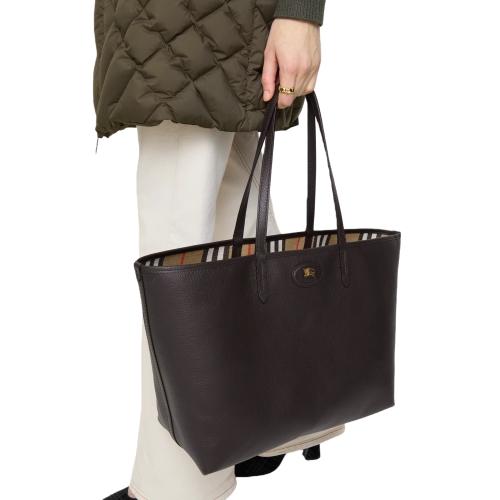 A spacious tote made in Italy from grainy calf leather, reversing to a Burberry Check cotton linen blend in our signature sand beige. The Bloomsbury collection is finished with a leather and metal Knight stamp, an archival motif first seen on Burberry bags in the 1980s. Comes with a detachable press-stud pouch to secure smaller items.