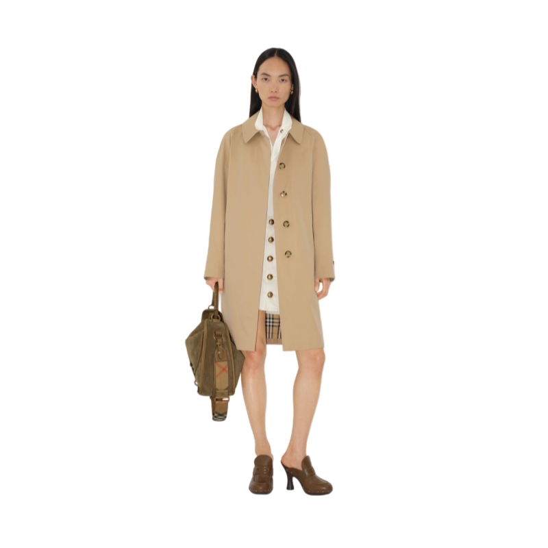 The streamlined Camden car coat is distinguished by its pared-back silhouette and concealed button closure. Predating the trench, Burberry has been crafting car coats since the 1880s, and the heritage-inspired Camden is made in England from shower-resistant cotton gabardine, woven at the Burberry Mill. Tailored to a regular fit with rounded shoulders, the minimalist style balances understated sophistication with everyday versatility. Wear it open over layers to reveal a subtle hint of Burberry Check lining.
