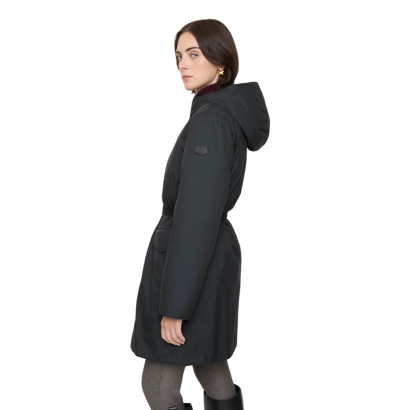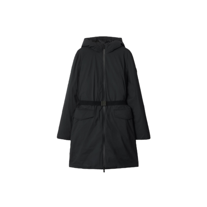 A hooded coat in lightweight ripstop nylon, padded with goose down and feathers. The design is lined with fleece at the side pockets and appliquéd with a leather Knight stamp, an archival motif from the 1980s. Cut to a regular fit with an elasticated Burberry Check belt to cinch the waist.