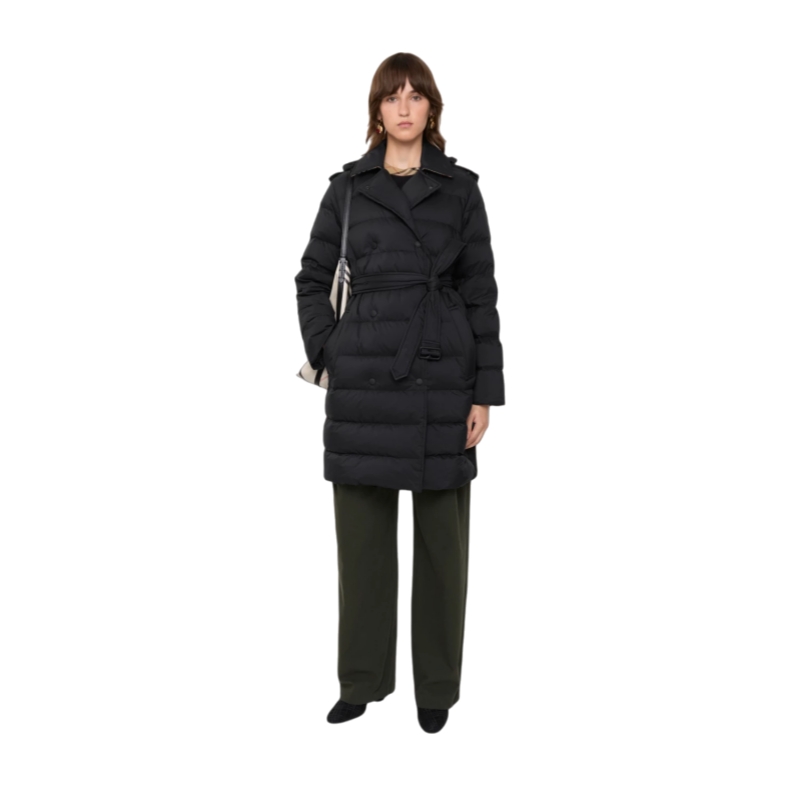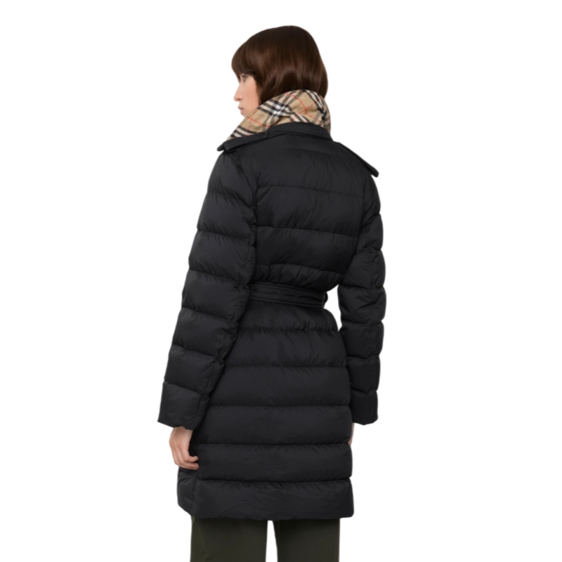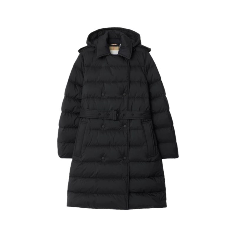 Inspired by the Burberry trench, a puffer coat in nylon filled with goose down and feathers. The double-breasted design is cut to a regular fit with signature epaulettes and a detachable B buckle belt. Adapt the silhouette by removing the hood and pop the collar to reveal a flash of Burberry Check.