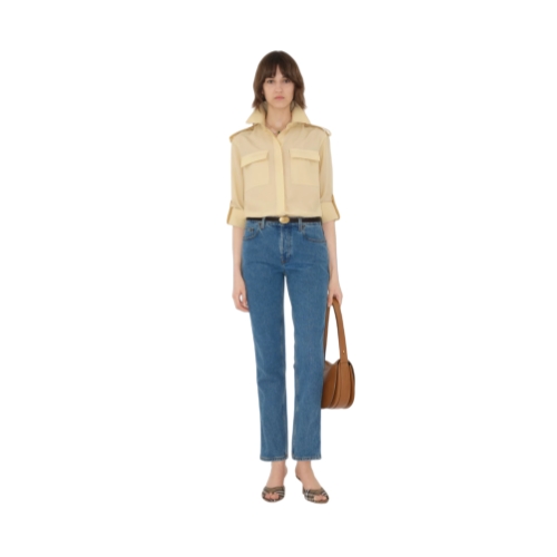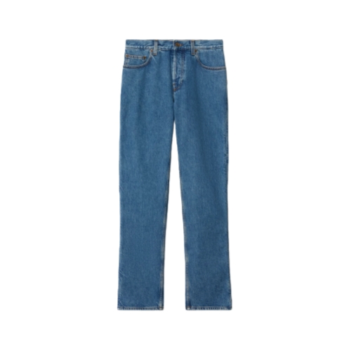 Jeans made in Italy from stretch denim in a mid-blue wash. The five-pocket style is cut to a straight fit and features a suede patch embossed with the Equestrian Knight Design.