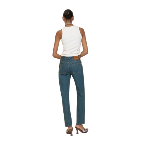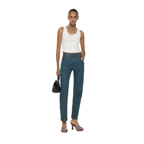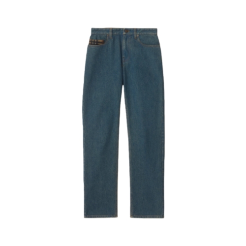 Jeans made from heavyweight stretch denim in a mid-blue wash. The five-pocket style is cut to a straight fit and features a suede patch embossed with the Equestrian Knight Design. The coin pocket and inner waistband are printed with Burberry Check.