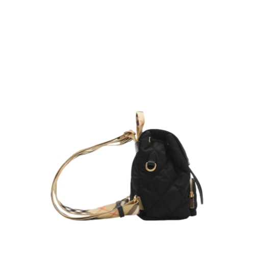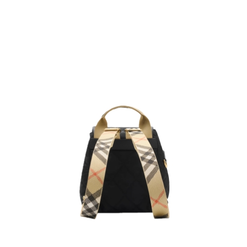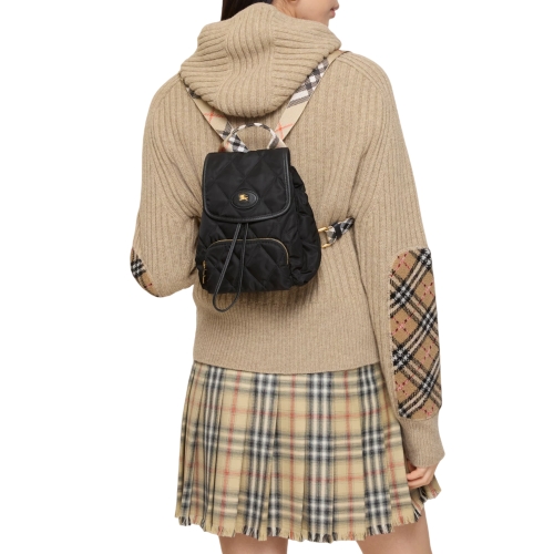 Inspired by country pursuits, the Horseshoe backpack is made from quilted nylon with Burberry Check webbing straps in our signature sand beige colourway. The compact design is detailed with leather trims and our Knight stamp, an archival motif first seen on Burberry bags in the 1980s. Use the D-ring at the side to personalise with charms.